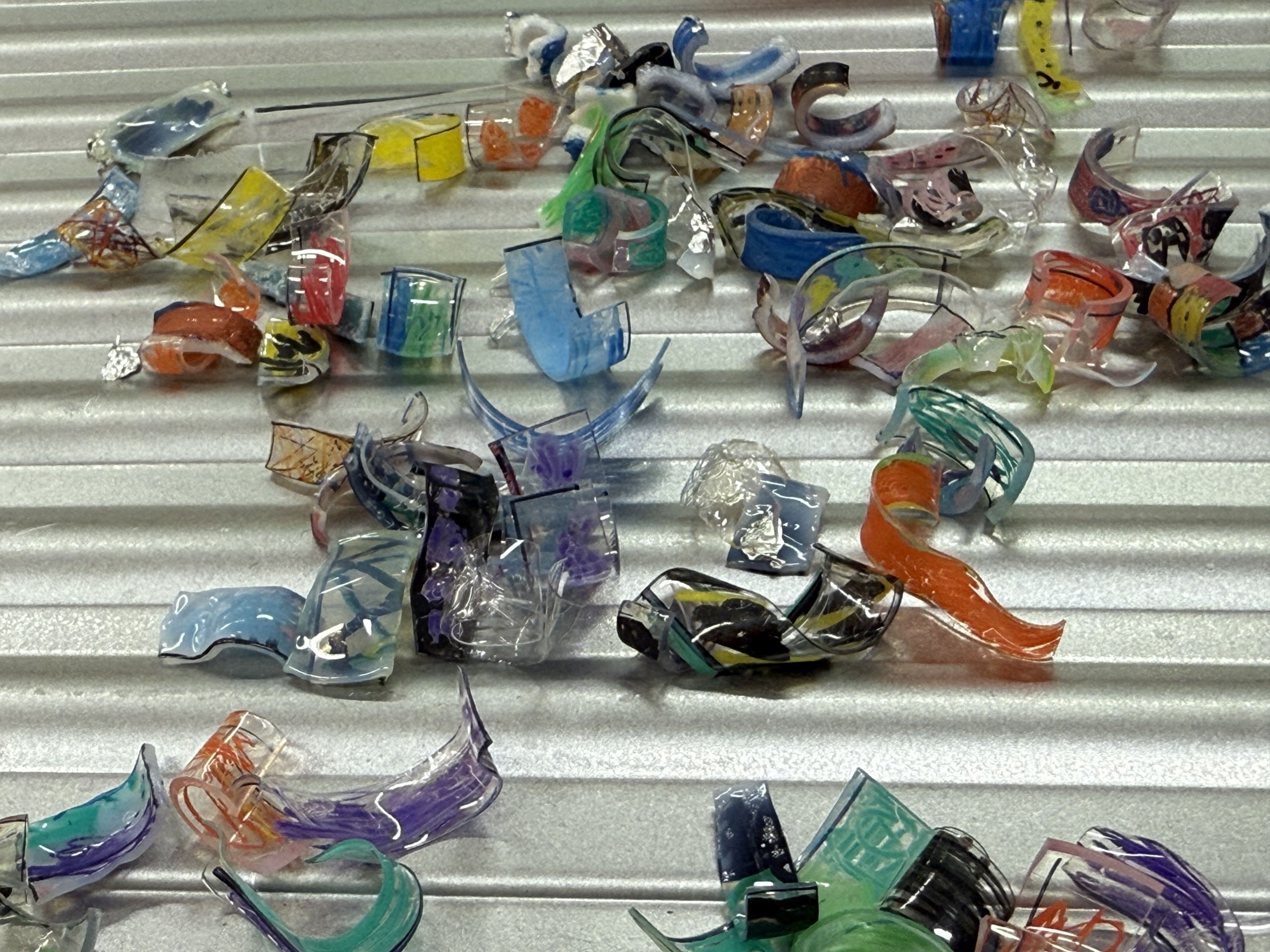ペットボトルのボディみ切り取り、色付けして、オーブントースターで熱を加えると、とーっても可愛いビーズができました!