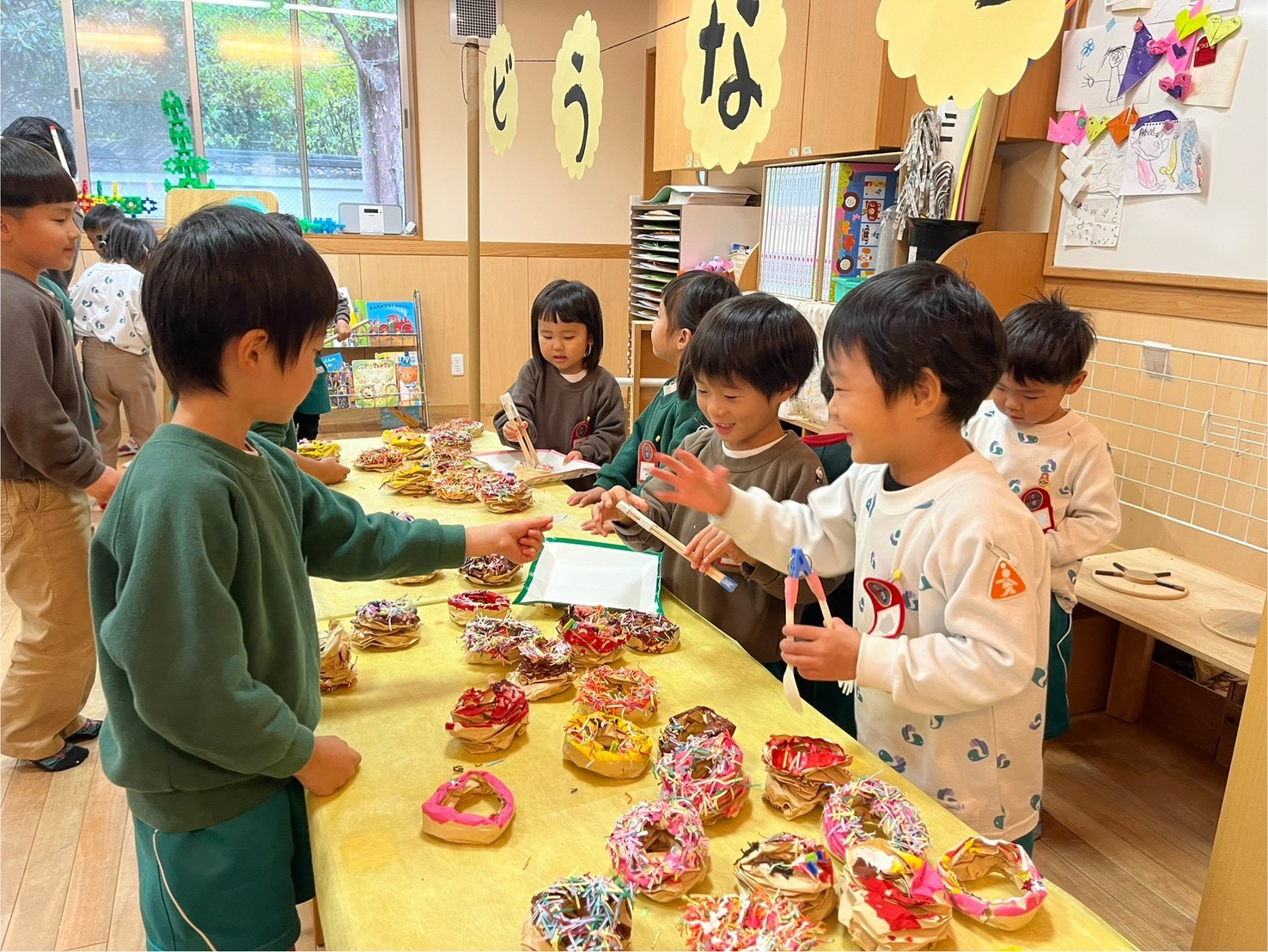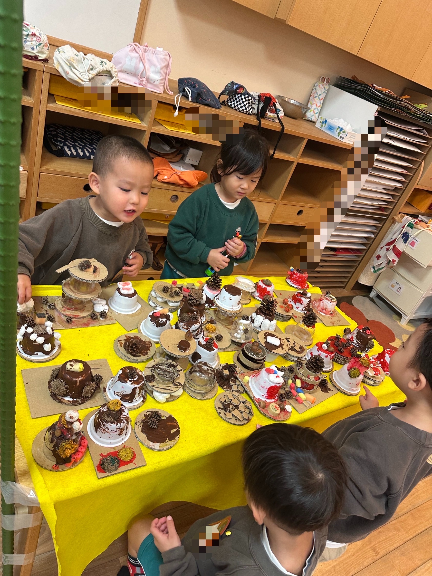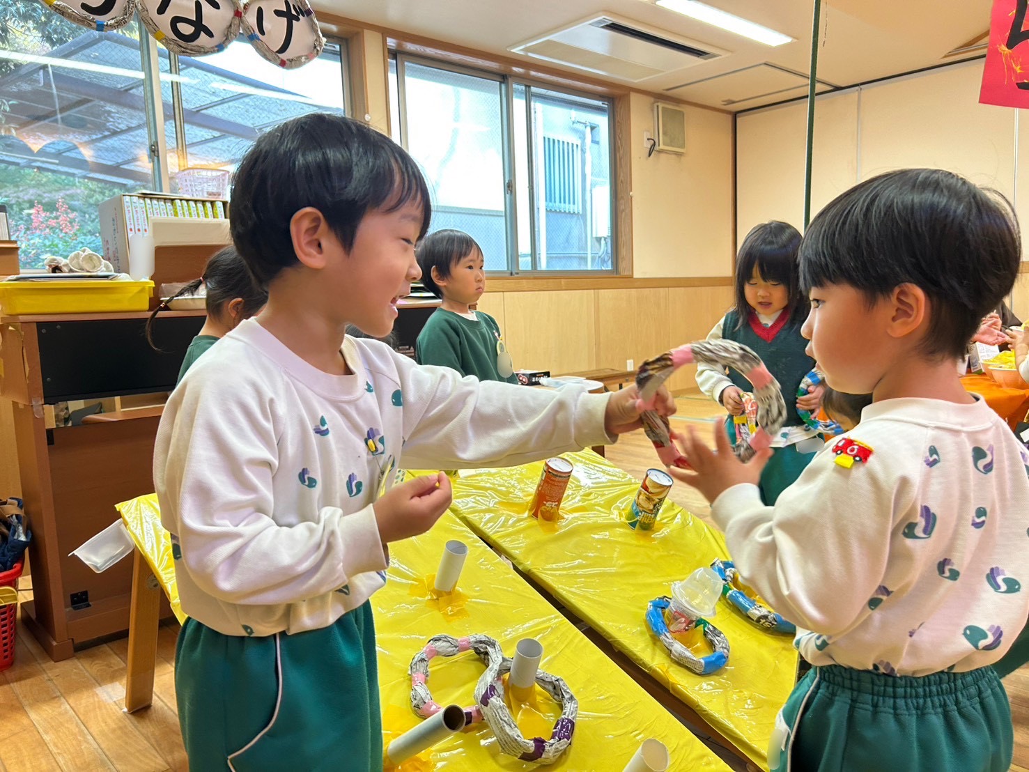 素材製作あそびが盛り上がり、ボンドや絵の具と共にハサミなどの用具も使って品物を作り、"ちびっこバザー(お店屋さんごっこ)"を親子で楽しみました。「いらっしゃいませ〜!」の元気な声が、どのクラスからも聞こえていました!
