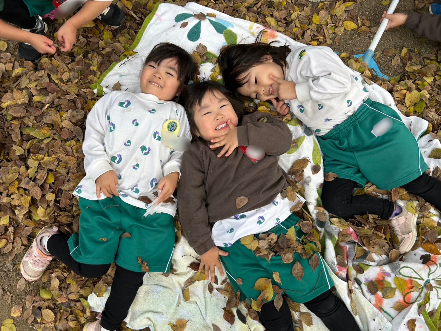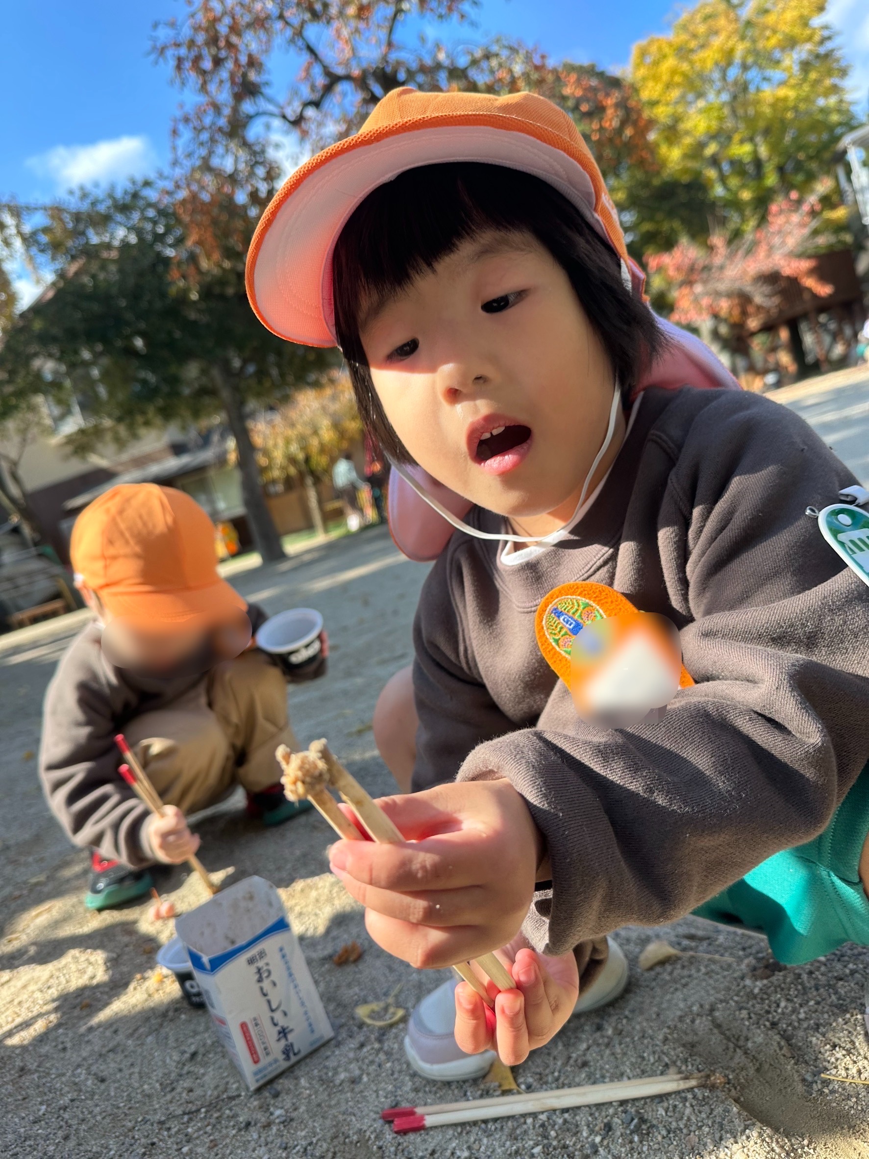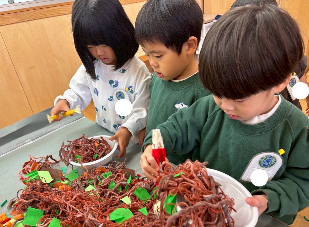 朝晩めっきり冷え込み、園庭の木々が色付き、落ち葉や木の実を使って遊ぶ様子がみられます。