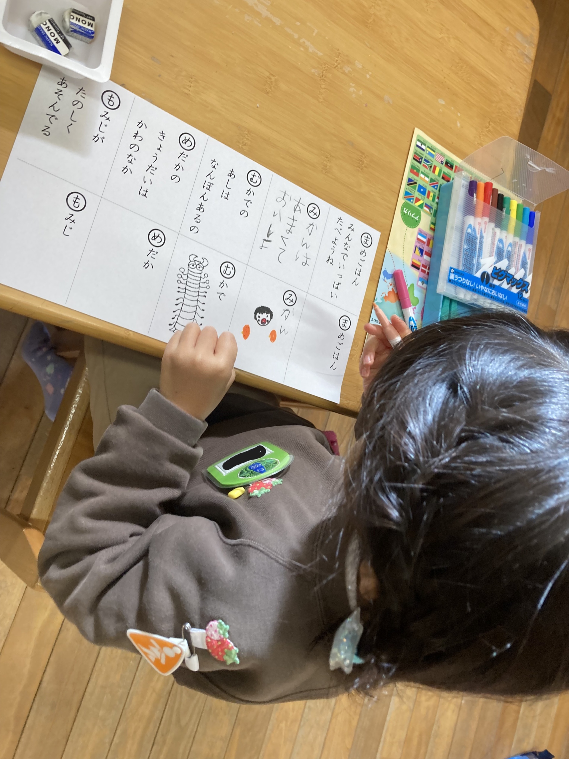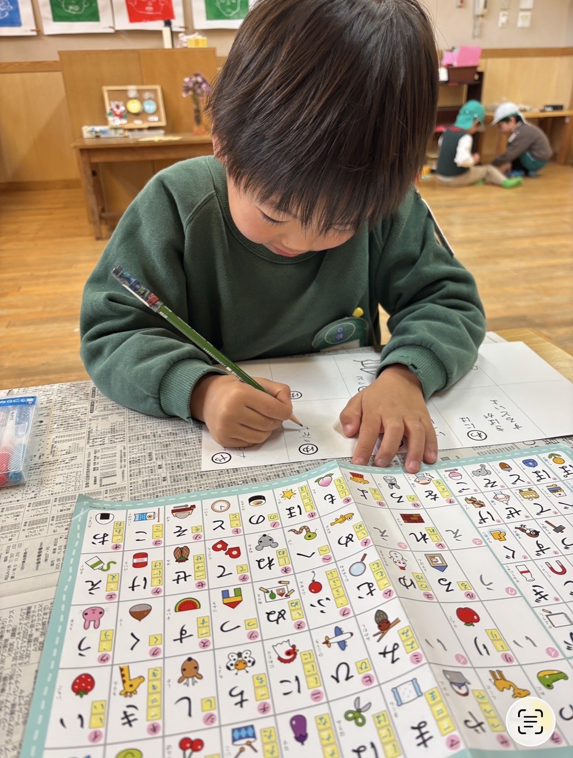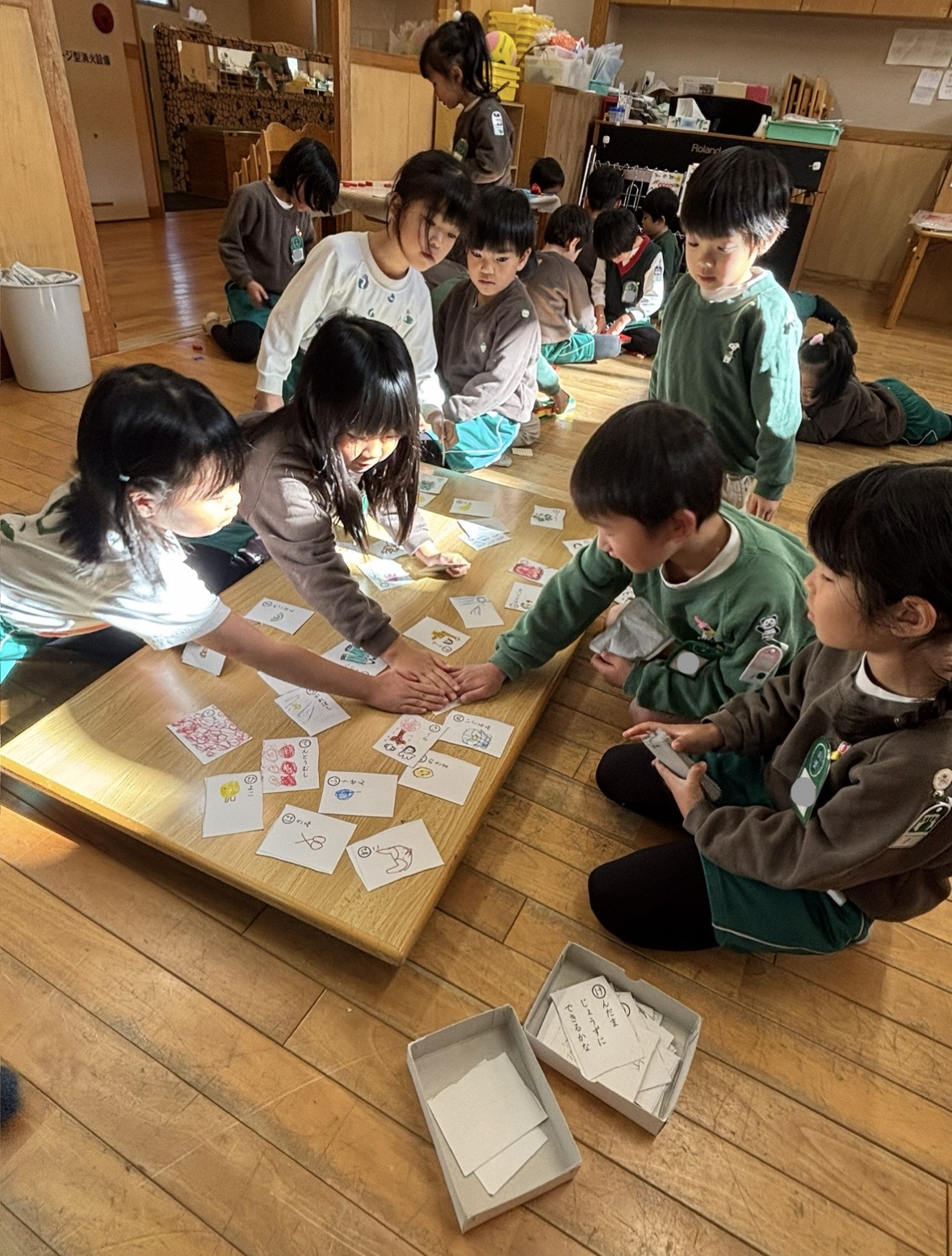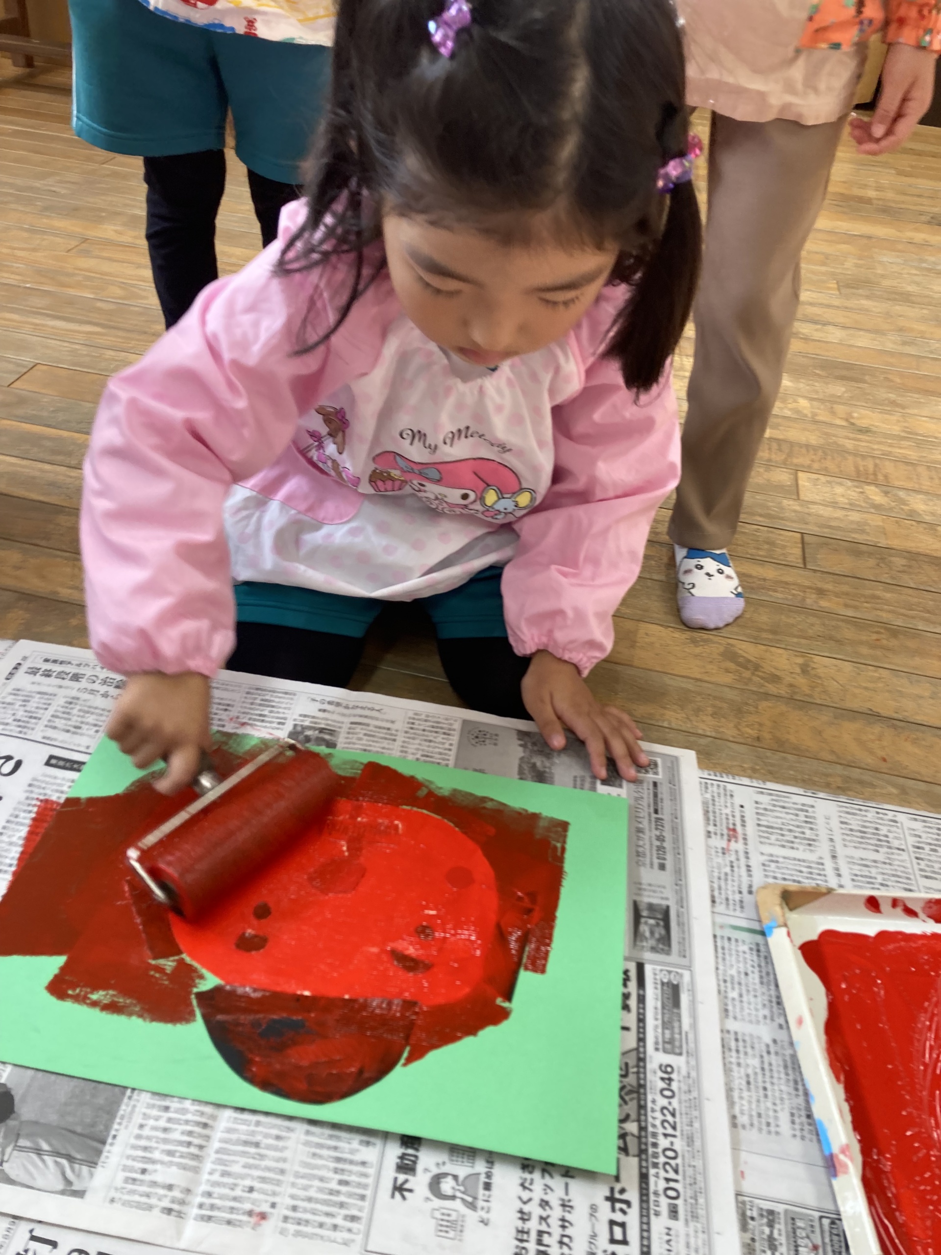 2学期も残りわずか、、、。年長組では、新年に向けたカレンダー製作で版画作りに挑戦したり、自分だけのオリジナルカルタを作ったりしました。様々な技法や文字に触れながら、1年の終わりを感じ、新年に期待を膨らませたりしていた子ども達。